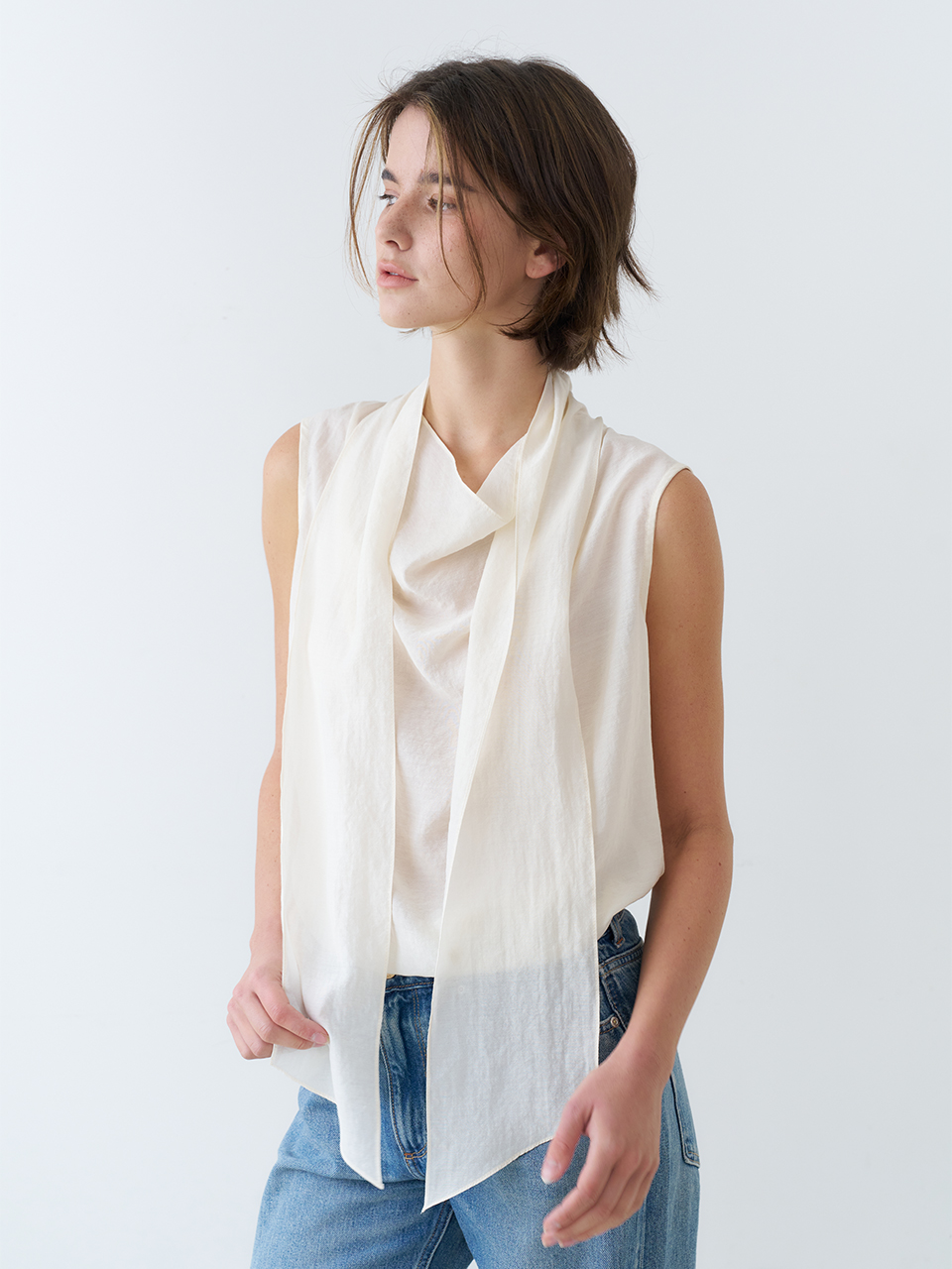 DRAPED TIE SLEEVELESS BLOUSE_CREAM