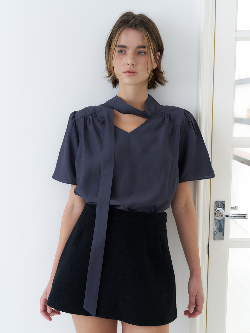 HALF SLEEVE TIE BLOUSE_CHARCOAL