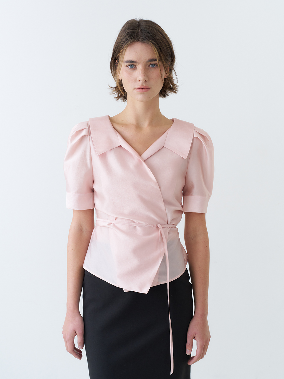 PUFF SLEEVE GLOSSY COLLAR WRAP BLOUSE_PINK