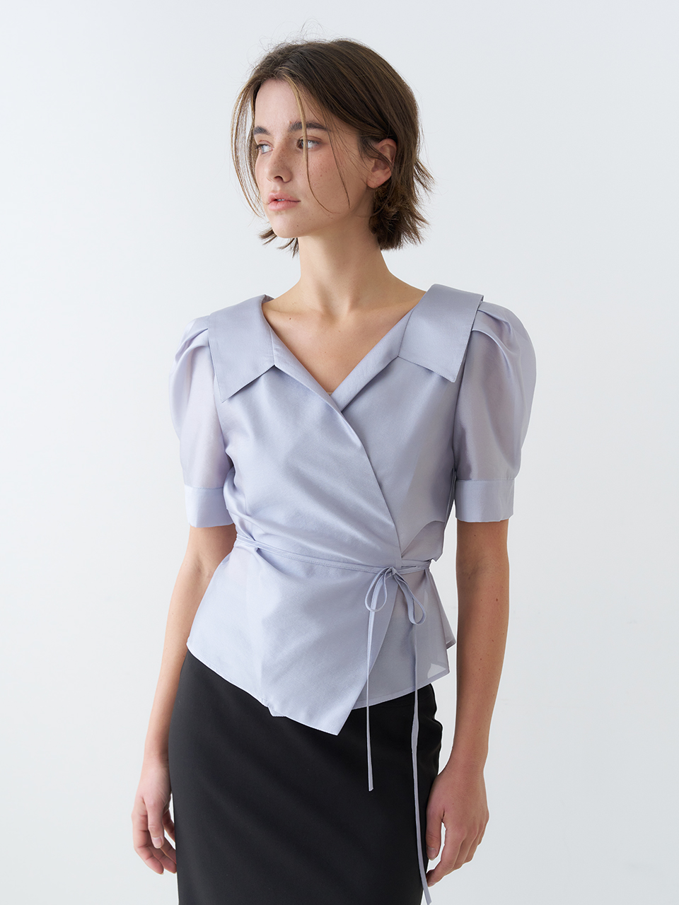 PUFF SLEEVE GLOSSY COLLAR WRAP BLOUSE_SKY BLUE