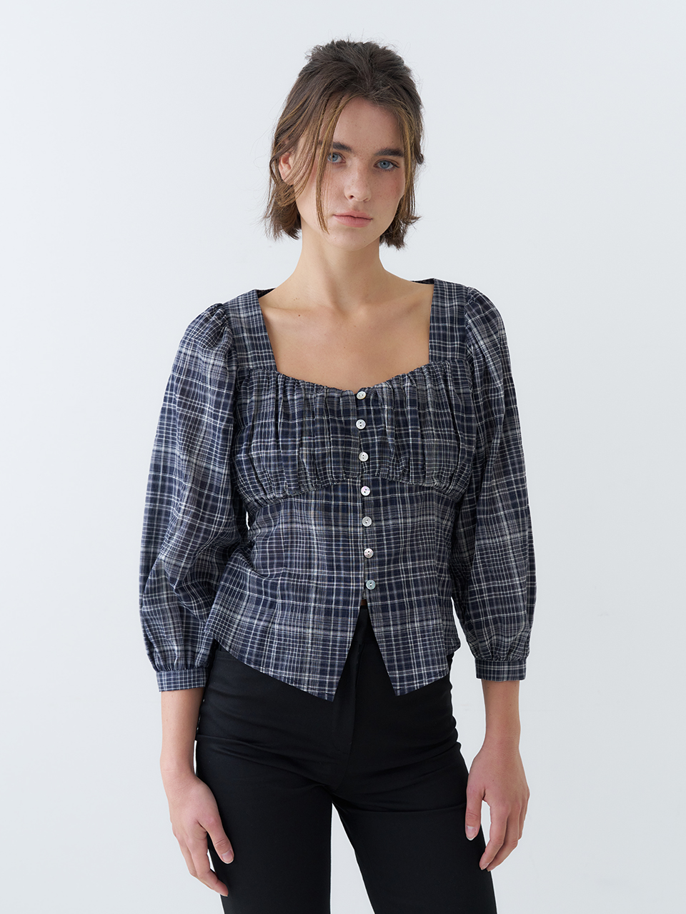 HEART NECK SHIRRING CHECK BLOUSE_NAVY